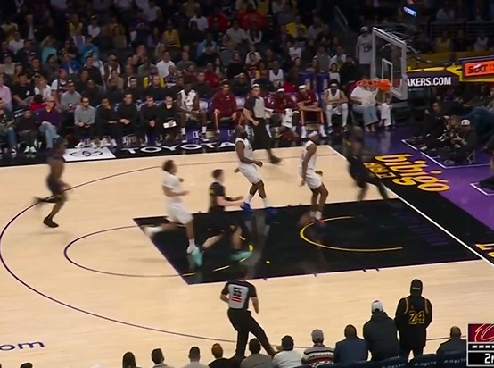 老头冲得真快!詹姆斯疾速推反击 背后击地妙传拉拉维亚停顿上篮